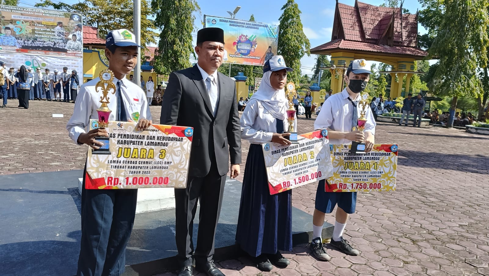 SMPN 1 Sematu Jaya (2/5/2023) - Setelah beberapa waktu lalu, tim SMPN 1 Sematu Jaya masuk dalam 3 besar juara LCC (Lomba Cerdas Cermat) Tingkat SMP/MTs Sekabupaten Lamandau, yakni juara 2, akhirnya pada hari ini hadiah dan pialanya telah diserahkan dan diterima oleh SMPN 1 Sematu Jaya, yang diwakili oleh salah satu tim LCC SMPN 1 Sematu Jaya, STEVIA MANGGRAENI. Adapun yang bertindak menyerahkan hadiah secara simbolis adalah Bupati Lamandau (Hendra Lesmana) di sela-sela Upacara Hari Pendidikan Nasional di halaman Kantor Dinas Pendidikan dan Kebudayaan Kabupaten Lamandau pada hari ini, Selasa, 2 Mei 2023.