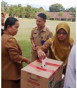 Setelah seluruh rangkaian kampanye dan penyampaian visi-misi selesai, kegiatan dilanjutkan dengan proses pencoblosan langsung. Seluruh guru dan siswa berpartisipasi dalam pemilihan ini dengan tertib dan antusias, menciptakan suasana demokratis yang hangat di halaman depan kantor sekolah.